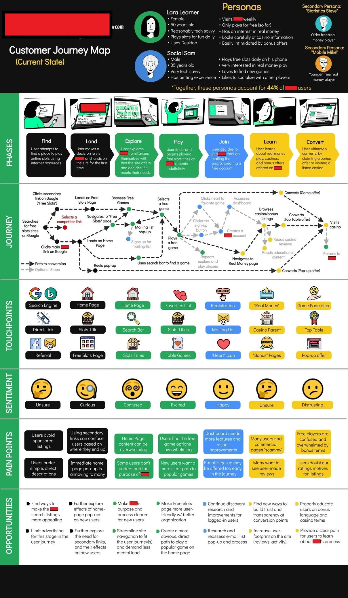 Customer Journey Maps created to outline the user journey, based on qualitative and quantitative objective data from over 20 studies.